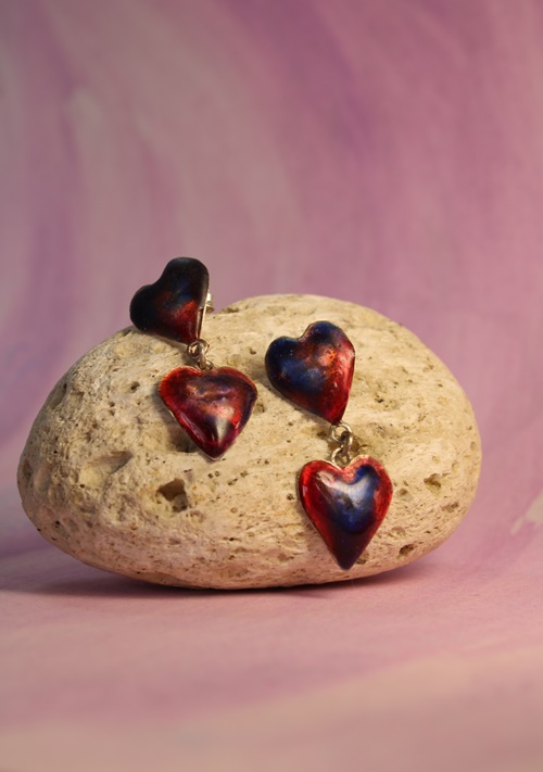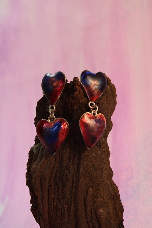 Hand made silver heart earrings made with enamel '' contemporary'' technique.